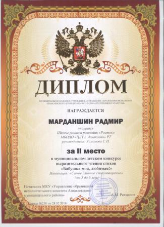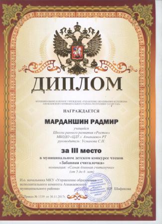 3 место в муниципальном детском конкурсе чтецов «Забавная считалочка» (Марданшин Р., Усманова С.Н.)