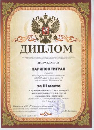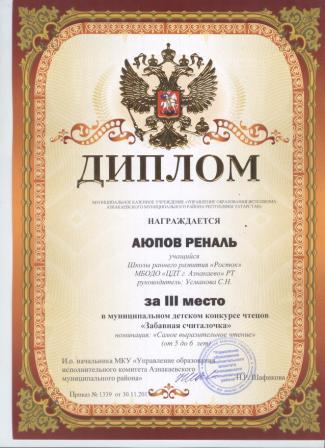 3 место в муниципальном детском конкурсе чтецов «Забавная считалочка» (Аюпов Р., Усманова С.Н.)