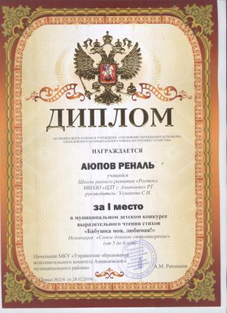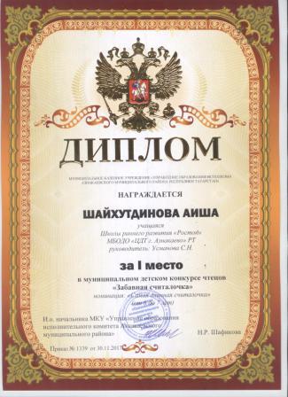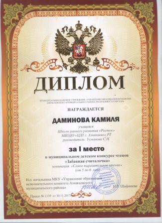 1 место в муниципальном детском конкурсе чтецов «Забавная считалочка» (Шафиков Д., Усманова С.Н.)