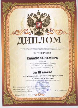 3 место в муниципальном детском конкурсе чтецов «Забавная считалочка» (Салахова С., Усманова С.Н.)