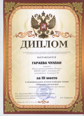 3 место в муниципальном детском конкурсе чтецов «Забавная считалочка» (Гараева Ч., Усманова С.Н.)