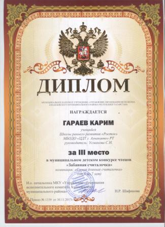 3 место в муниципальном детском конкурсе чтецов «Забавная считалочка» (Гараев К., Усманова С.Н.)