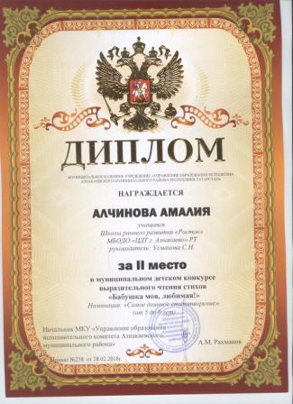 2 место в муниципальном детском конкурсе чтецов «Забавная считалочка» (Алчинова А., Усманова С.Н.)