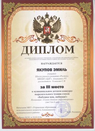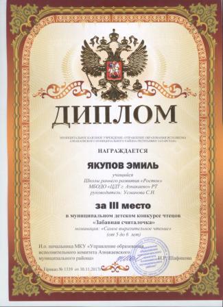 3 место в муниципальном детском конкурсе чтецов «Забавная считалочка» (Аюпов Э., Усманова С.Н.)