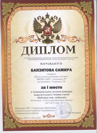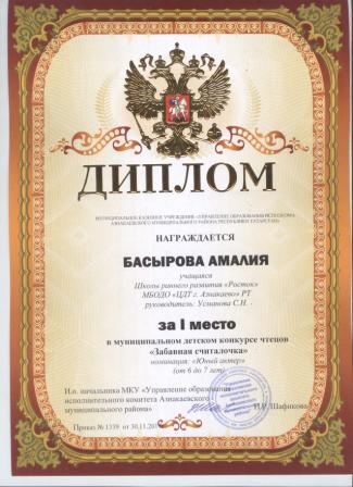 1 место в муниципальном детском конкурсе чтецов «Забавная считалочка» (Басырова А., Усманова С.Н.)