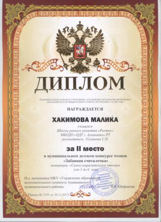 2 место в муниципальном детском конкурсе чтецов «Забавная считалочка» (Хакимова М., Усманова С.Н.)