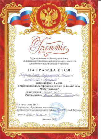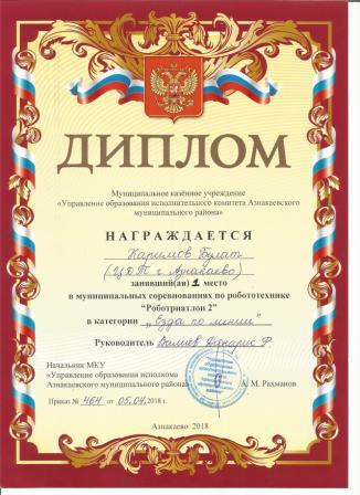 1 место в муниципальных соревнованиях по робототехнике «Роботриатлон – 2» (Каримов Б., Валиев Д.)