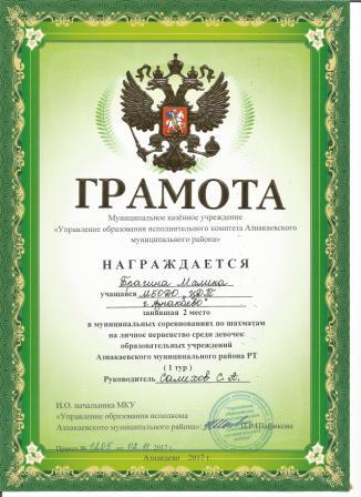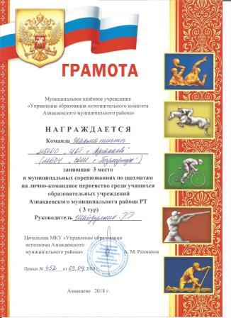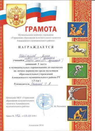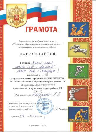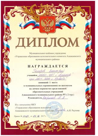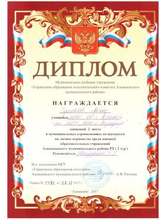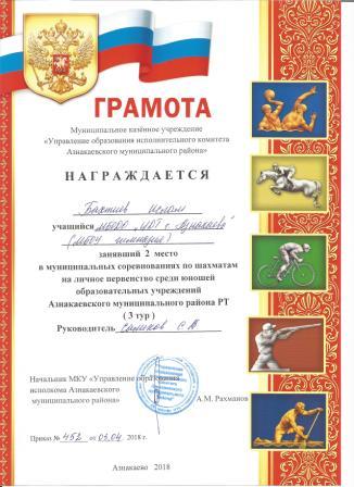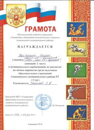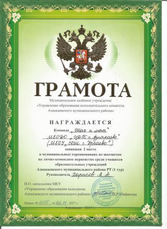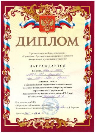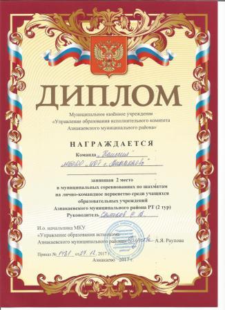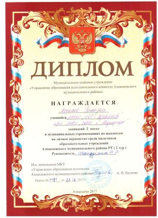 2 место в муниципальных соревнованиях по шахматам на личное первенство (Ахсанов Р., Шайдуллин Р.Р.)
