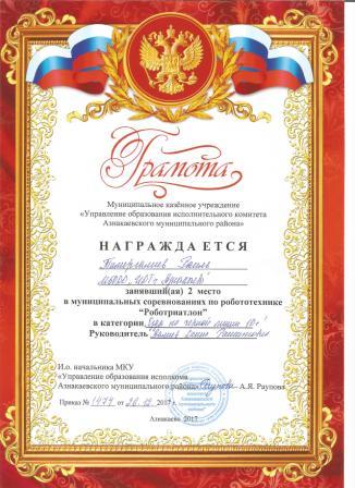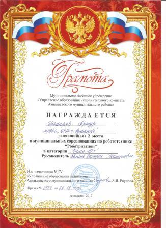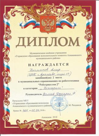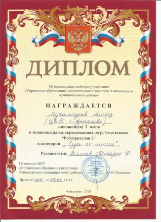 2 место в муниципальных соревнованиях по робототехнике «Роботриатлон – 2» (Нигматов А., Валиев Д.)