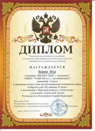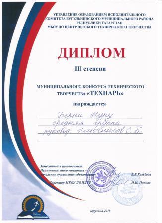 3 место в муниципальном конкурсе технического творчества «Технарь» (Берни Н., Ключников С.Б.)