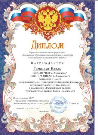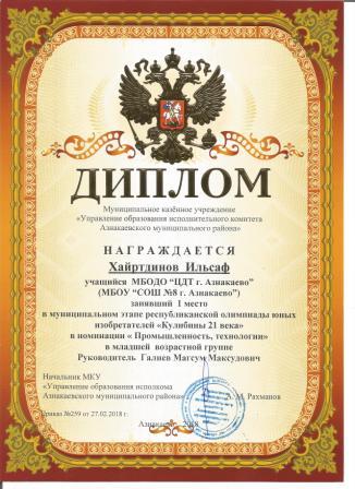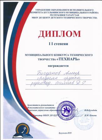 2 место в муниципальном конкурсе технического творчества «Технарь» (Богданов А., Валиев Д.Р.)
