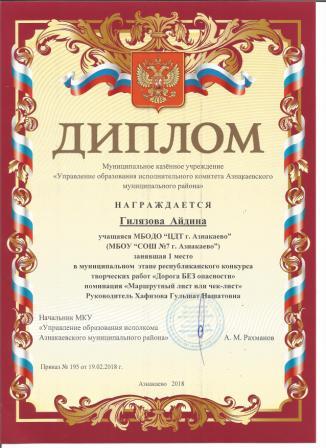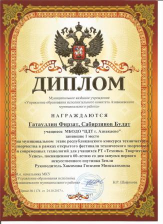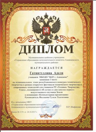 1 место в муниципальных соревнованиях по робототехнике «Роботриатлон» (Гатин А., Валиев Д.Р.)