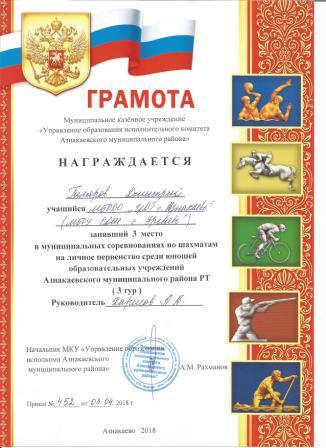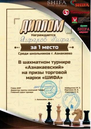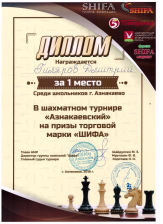 1 место в муниципальном шахматном турнире «Азнакаевский» (Гиляров Д.)