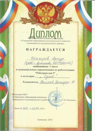 1 место в муниципальных соревнованиях по робототехнике «Роботриатлон – 2» (Шакиров А., Валиев Д.)