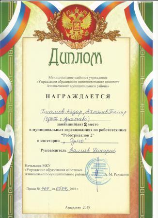 2 место в муниципальных соревнованиях по робототехнике «Роботриатлон – 2» (Хисамов А., Валиев Д.)