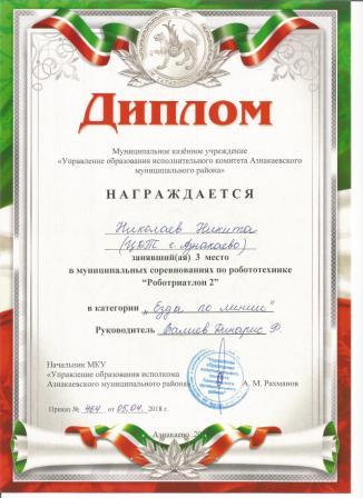 3 место в муниципальных соревнованиях по робототехнике «Роботриатлон – 2» (Николаев Н., Валиев Д.)