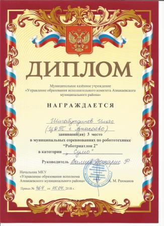 3 место в муниципальных соревнованиях по робототехнике «Роботриатлон» (Шарифуллин Д., Валиев Д.Р.)