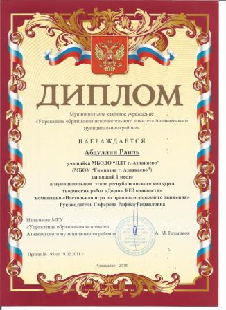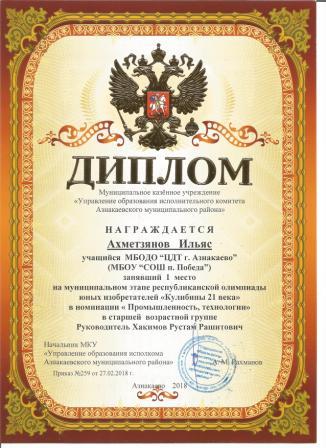 1 место в муниципальных соревнованиях по робототехнике «Роботриатлон» (Абдуллин Н., Валиев Д.Р.)