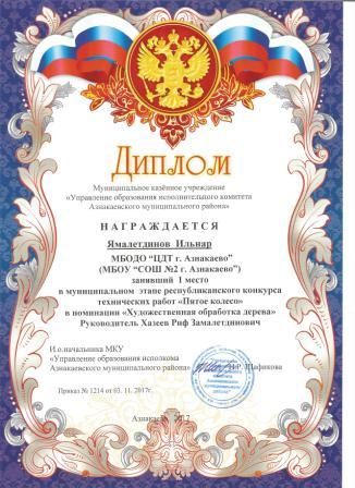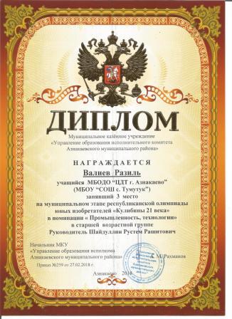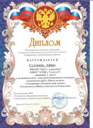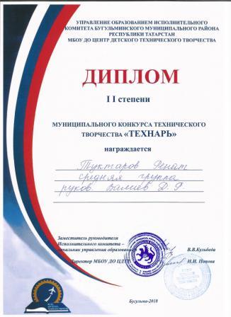 2 место в муниципальном конкурсе технического творчества «Технарь» (Туктаров Р., Валиев Д.Р.)