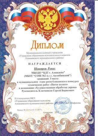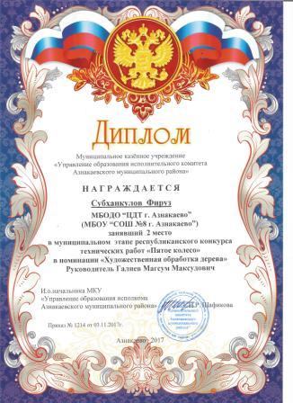 2 место в муниципальном конкурсе технического творчества «Технарь» (Саубанов Р., Валиев Д.Р.)