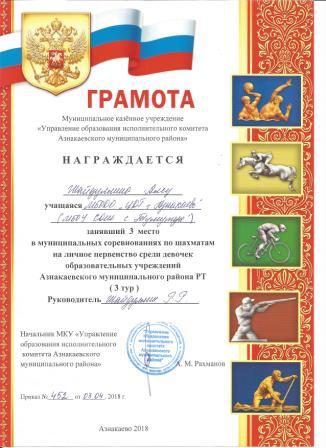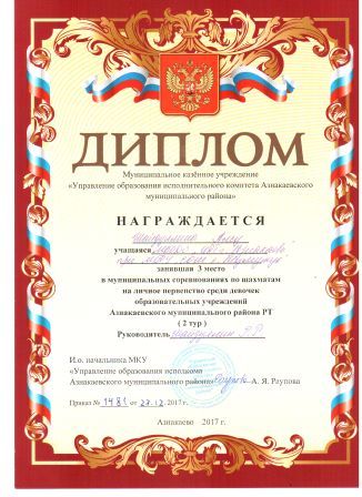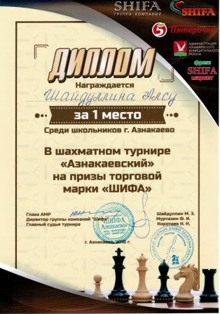 1 место в муниципальном шахматном турнире «Азнакаевский» (Шайдуллина А.)