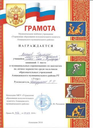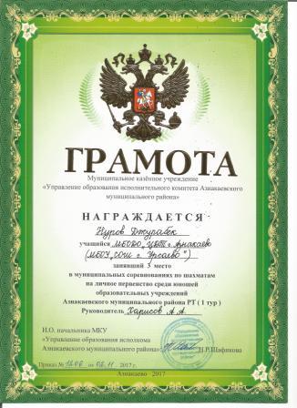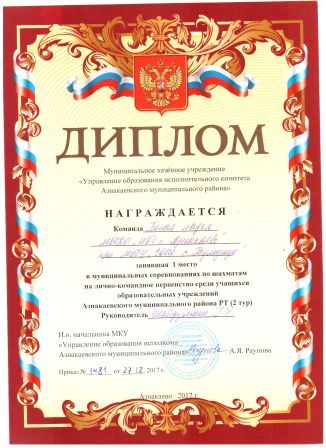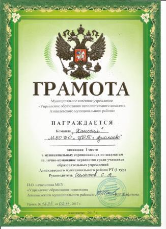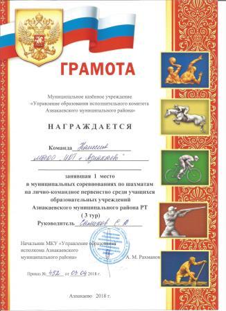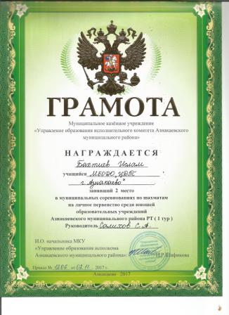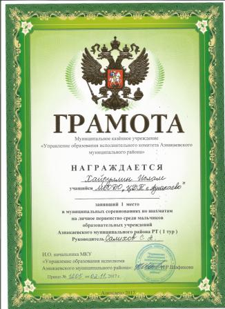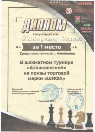 1 место в муниципальных соревнованиях по шахматам на личное первенство (Хайруллин И., Салихов С.А.)
