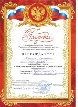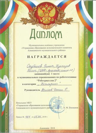 1 место в муниципальных соревнованиях по робототехнике «Роботриатлон – 2» (Саубанов Р., Валиев Д.)