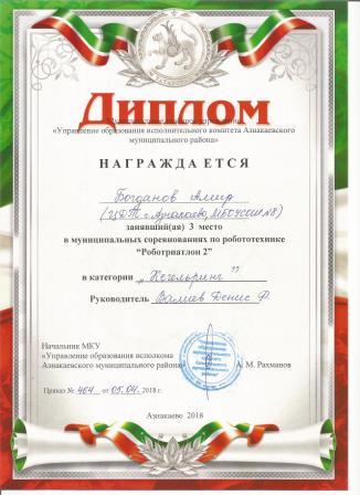 3 место в муниципальных соревнованиях по робототехнике «Роботриатлон – 2» (Богданов А., Валиев Д.)