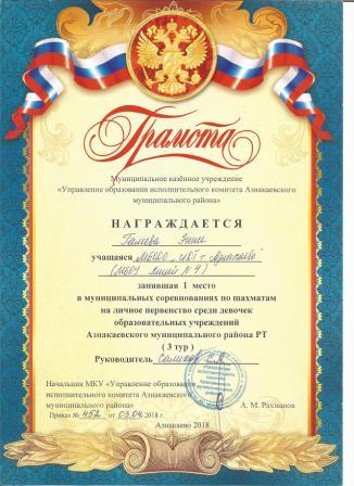 1 место в муниципальных соревнованиях по шахматам на личное первенство (Галиева Э., Салихов С.А.)