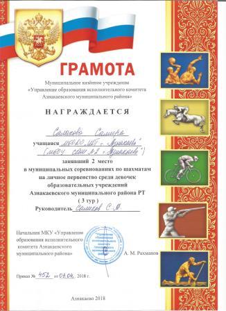2 место в муниципальных соревнованиях по шахматам на личное первенство (СултановА., Шайдуллин Р.Р.)