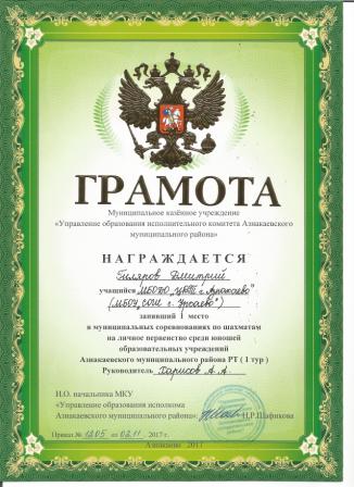 1 место в муниципальных соревнованиях по шахматам на личное первенство (Гиляров Д., Харисов А.А.)