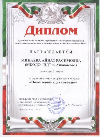1 место на муниципальном творческом конкурсе "Новогоднее вдохновение" (Минаева А.Р.)