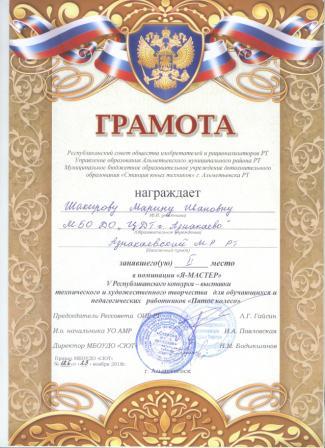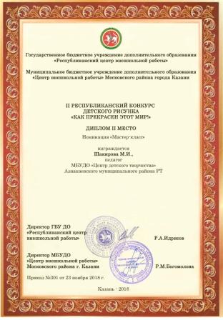 2 место в Республканском конкурсе детского рисунка "Как прекрасен этот мир" (Шакирова М.И.)
