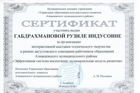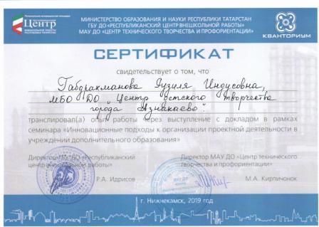 Сертифкат о трансляции опыта через выступление с докладом (Габдрахманова Р.И.)