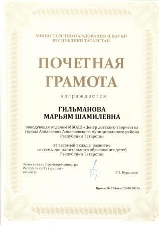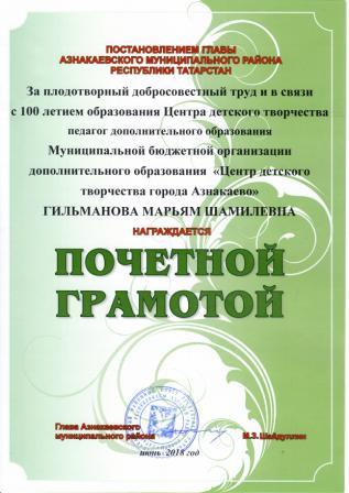 Почетная грамота за плодотворный добросовестный труд (Гильманова М.Ш.)