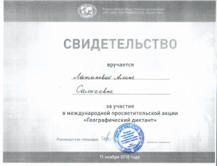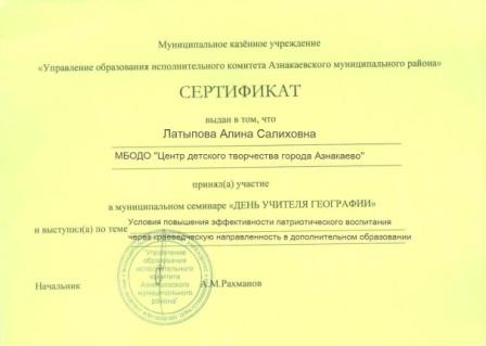 Сертификат об участии в муниципальном семинаре "День учителей географии" (Латыпова А.С.)