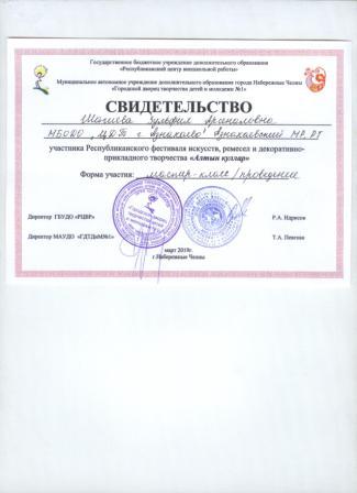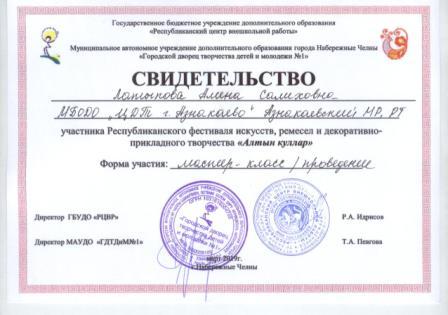 Свидетельство о проведении мастер-класса на Республиканском фестивале "Алтын куллар" (Латыпова А.С.)