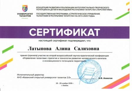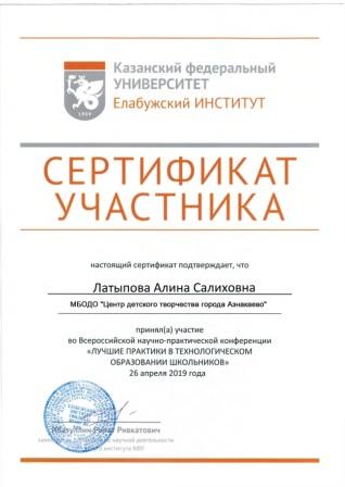 Сертификат об участии во Всероссийской научно-практической конференции (Латыпова А.С.)