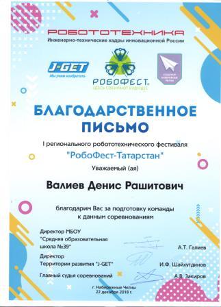 Благодарственное письмо за подготовку команды к соревнованиям (Валиев Денис)