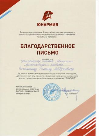 Благодарственное письмо за личный вклад в патриотическое восптание детей и молодежи (Зиганшин Р.С.)