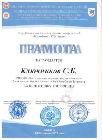 Благодарность за подготовку финалтсиа республиканской олимпиады "Кулибны 21 века" (Ключников С.Б.)