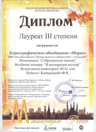 3 место в Международном фествале-конкурсе детского творчества («Мирас», Кадырмаева Ф.К.)
