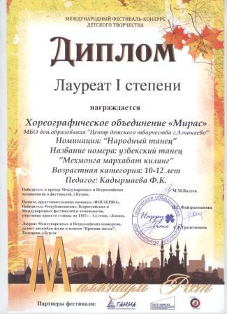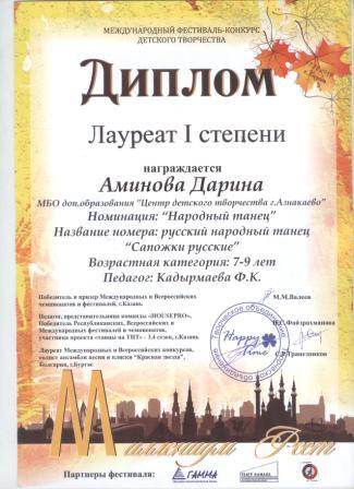 1 место в Международном фествале-конкурсе детского творчества (Аминова Д., Кадырмаева Ф.К.)