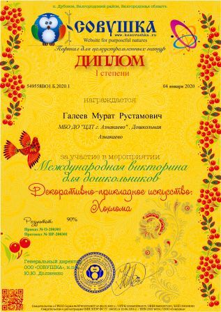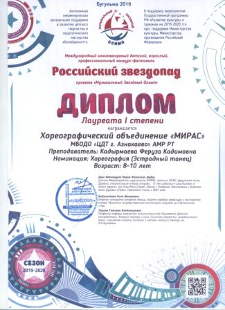 1 место в Международном фествале-конкурсе детского творчества («Мирас», Кадырмаева Ф.К.)