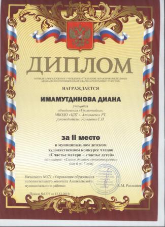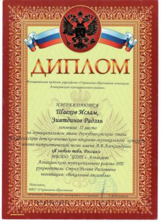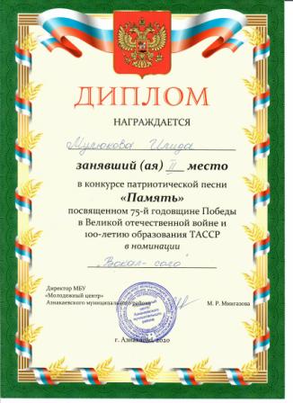 2 место в конкурсе патриотической песни "Память" (Мулюкова И,, Зарипова Л.И.)