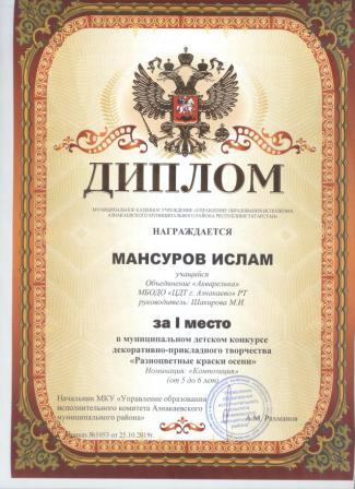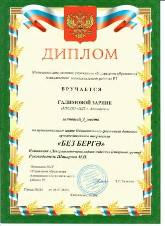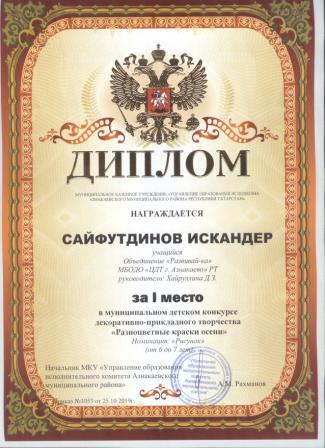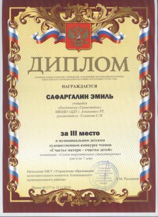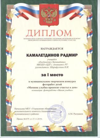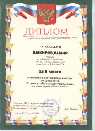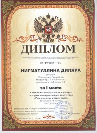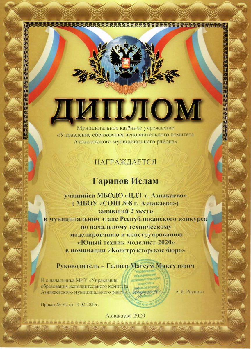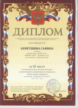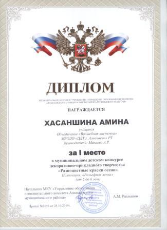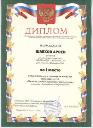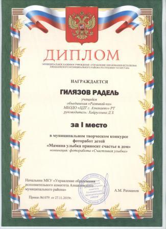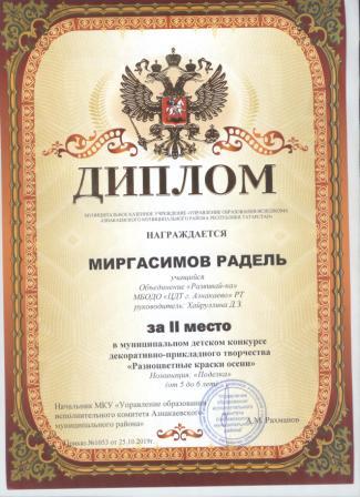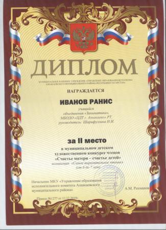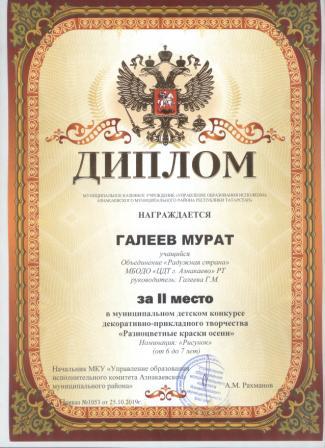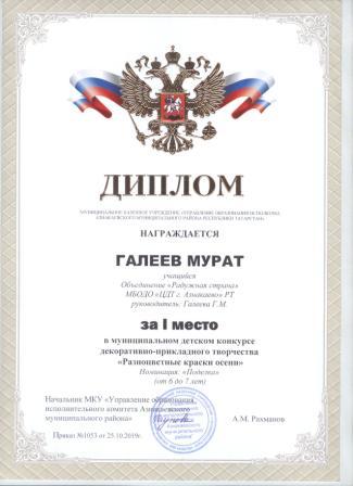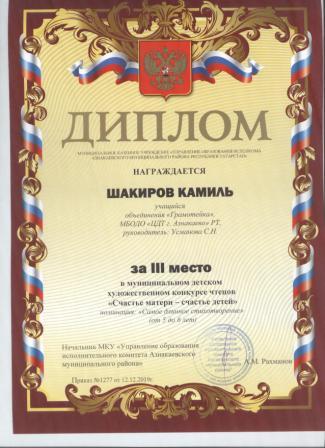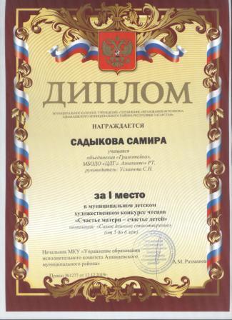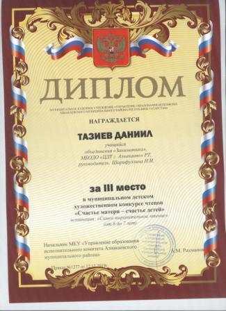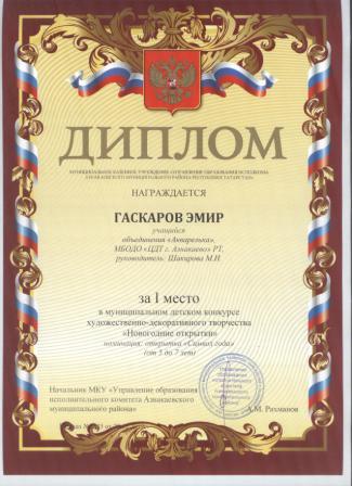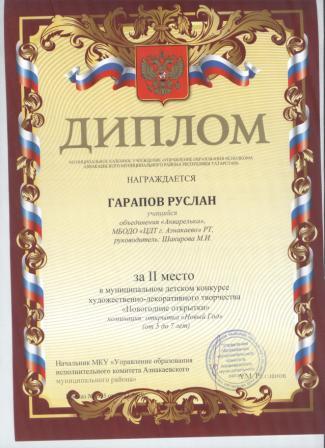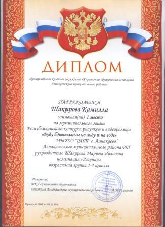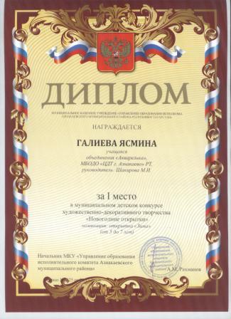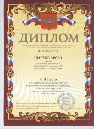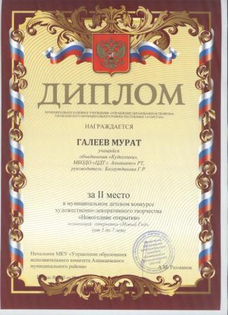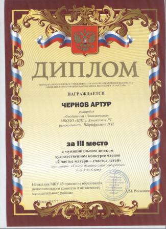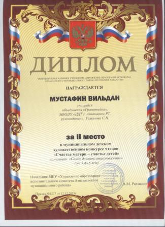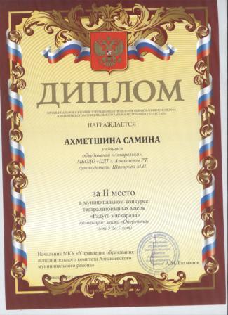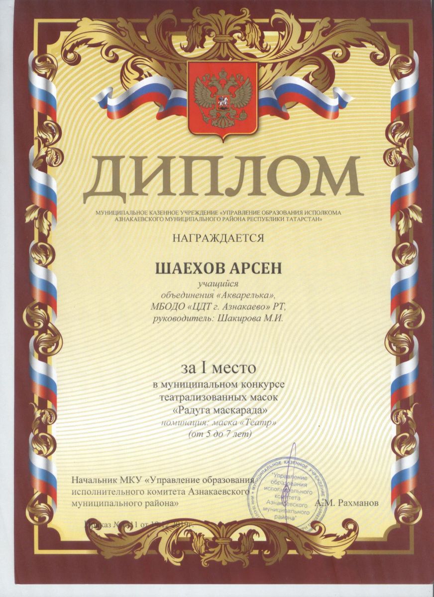 1 место в муниципальном конкурсе театральных масок «Радуга маскарада» (Шаехов А., Шакирова М.И.)
