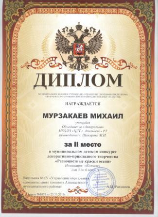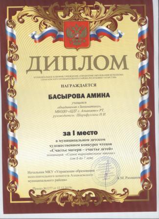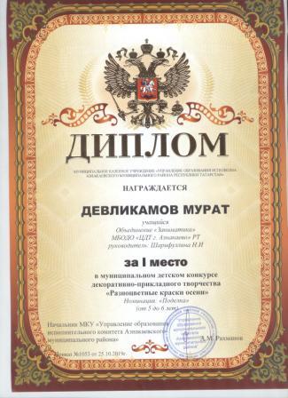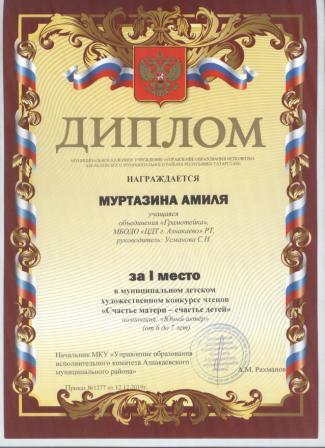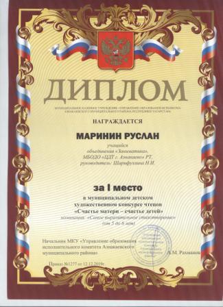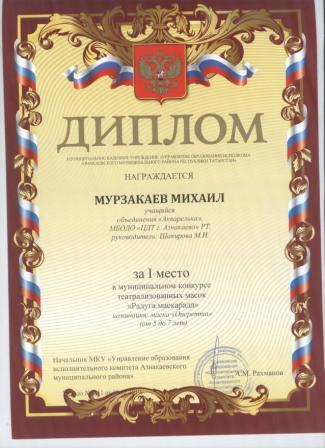 1 место в муниципальном конкурсе театральных масок «Радуга маскарада» (Мурзакаев М., Шакирова М.И.)