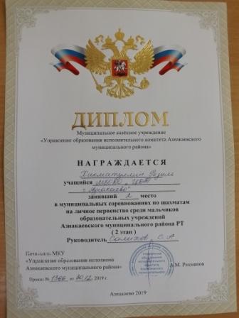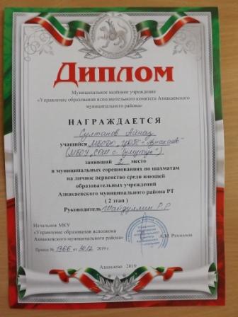 2 место в муниципальных соревнованиях по шахматам на личное первенство (Шайхулов А., Салихов С.А.)