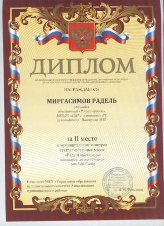 2 место в муниципальном конкурсе театральных масок «Радуга маскарада» (Миргасимов Р., Шакирова М.И.)