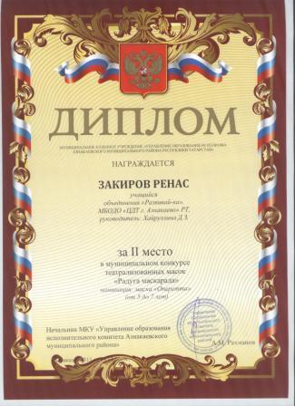 2 место в муниципальном конкурсе театральных масок «Радуга маскарада» (Закиров Р., Хайруллина Д.З.)